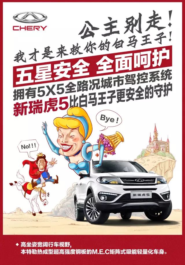 當(dāng)然是新瑞虎5,虎嘯下山,成功解救了公主!擁有5X5全路況城市駕控系統(tǒng)的新瑞虎5,不僅擁有1.5T渦輪增壓引擎的快速“逃跑”能力,更有M.E.C矩陣式吸能輕量化車(chē)身高采用本特勒熱成型超高強(qiáng)度鋼板和環(huán)護(hù)式安全四氣囊護(hù)得公主平安無(wú)事,給公主打造五星級(jí)安全呵護(hù),連白馬王子都比不了的滿滿安全感!