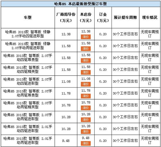 廣西長道2013款哈弗H5,無優(yōu)惠,送愛車大禮包。2013款哈弗H5智尊版新車匹配6MT變速箱,有兩驅(qū)、四驅(qū)可選。售價區(qū)間為9.48萬-12.38萬。感興趣的朋友可以到店咨詢或致電咨詢!緩V西長道:安吉4S店 0771-2330301;白沙4S店 0771-5780390;安吉直營店 0771-3922501】