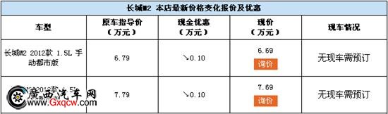 近日,廣西長(zhǎng)道汽車(chē)店內(nèi)長(zhǎng)城M2,顏色可選,目前購(gòu)車(chē)部分車(chē)型可優(yōu)惠1000元,感興趣的朋友可以到店咨詢(xún)購(gòu)買(mǎi),詳情見(jiàn)下表: