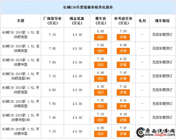 金九銀十,感恩鉅惠。深秋全系團(tuán)購會(huì)。2015款長城C30新車上市,現(xiàn)金直降3000元,無現(xiàn)車需預(yù)訂。更有機(jī)會(huì)抽取“有道集團(tuán)12周年慶,萬元豪禮等你拿”活動(dòng)。趕緊行動(dòng)吧!2015款C30由內(nèi)而外顛覆式銳變,完美實(shí)現(xiàn)時(shí)尚、科技與精致的極致結(jié)合。感興趣的朋友可以到店咨詢購買,廣西長道服務(wù)熱線:安吉大道(往武鳴方向)高速路口長城4S店(0771-2330301);白沙大道亭江立交旁(金灣花城斜對面)長城4S旗艦店:(0771-5780390)。我們將竭誠為您服務(wù)!