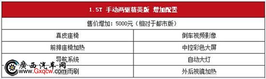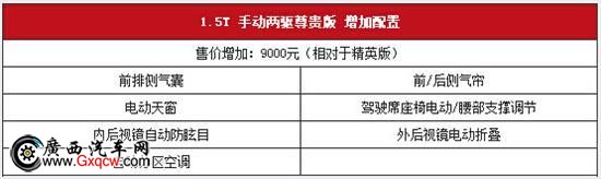 高配的尊貴型比精英型僅僅高出九千元,卻配備了電動(dòng)天窗和自動(dòng)空調(diào),電調(diào)座椅,以及右前盲區(qū)可視等高端豪華車型才能擁有的功能,并且能夠選裝氙氣大燈和大燈清洗等功能,安全,方便,非常適合喜歡炫酷的型男和優(yōu)雅時(shí)尚的都市白領(lǐng)女性。