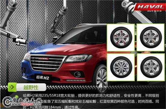 哈弗H2擁有SUV的高通過(guò)性,接近角22°,離去角27°,空載離地間隙184mm,哈弗H2采用235/55 R18的寬大輪胎,胎寬與中級(jí)SUV相當(dāng),同級(jí)別**。寬大的輪胎可以提供更好的抓地力和舒適性,安全性更高,可以去更多的地方旅行,提高生活質(zhì)量。新推出的哈弗H2四驅(qū)版提供了專業(yè)越野車型的選擇,對(duì)于喜歡戶外越野的車友們是個(gè)好消息。