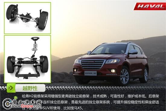 哈弗H2采用雙T動(dòng)力,六速手動(dòng)變速箱,速比臺(tái)階減小,齒比綿密,使得駕駛更平順、更省油,可以適應(yīng)更多的路況和駕駛需求。哈弗H2前懸架采用增強(qiáng)型麥弗遜獨(dú)立前懸架,技術(shù)成熟,可靠性好,維護(hù)成本低。后懸架為SUV專用的多連桿獨(dú)立后懸架,更可提升操控穩(wěn)定性和乘坐舒適性,多為寶馬X5等豪華SUV采用。