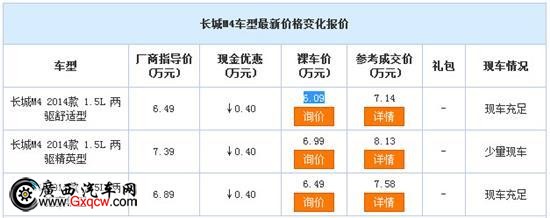 2014款長(zhǎng)城M4優(yōu)惠幅度僅針對(duì)在我司辦理金融按揭服務(wù)客戶適用,其他購(gòu)車(chē)方式優(yōu)惠情況請(qǐng)以店面銷(xiāo)售顧問(wèn)報(bào)價(jià)為準(zhǔn)。