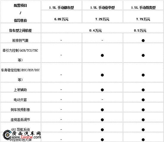 而售價7.29萬元的手動豪華型相比低配的手動都市型多出了牽引力控制、車身穩(wěn)定控制、上坡輔助、倒車視頻影像、座椅高低調(diào)節(jié)、GPS導(dǎo)航系統(tǒng)、中控臺彩色大屏共7項功能配置,性價比已經(jīng)有了顯著提升。如果在手動豪華型的基礎(chǔ)之上再多花費5000元去購買手動尊貴型的話,您還可以得到前排側(cè)氣囊、電動天窗、后視鏡加熱、后視鏡電動折疊和自動空調(diào),也是物有所值的。