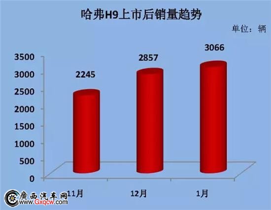 其中哈弗品牌旗下的重磅車型全地形七座SUV哈弗H9上市三個月,銷量連續(xù)攀升,并在1月份首次突破三千,達到3066輛。
