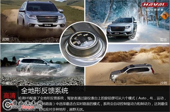 越野性方面,哈弗H9標準型標配的是智能電控四驅(AUTO2H4H4L),而哈弗H9豪華型和超豪華型標配的則是全地形反饋系統(tǒng)(AUTO、運動、沙地、雪地、泥地、4L)以及電子式差速鎖,哈弗H9標準型和豪華型可以選裝電子式差速鎖。全地形反饋系統(tǒng)的操作也非常簡單,駕駛者通過副儀表臺上的多功能顯示器旋鈕,便可從六個模式中選擇最適合實時路面的模式,系統(tǒng)會自動控制驅動力和制動力,達到**驅動和制動。
