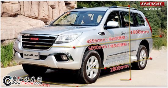 作為哈弗系列SUV的旗艦車型,哈弗H9的車身尺寸非常寬大,長寬高為4856mm(吊掛式備胎)/5090mm(背負式備胎)×1926mm×1900mm,軸距2800mm,明顯比同規(guī)格的SUV車型大一圈,車內空間寬敞,霸氣十足。