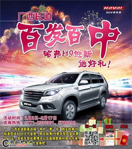 即日起到店訂購哈弗H9,現車任選任提!廣西長道長城、哈弗4S店還有多重新年好禮送給您!