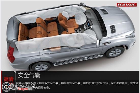 安全配置方面,哈弗H9自然不能馬虎,所有車型的配置幾乎一致,包括ESP、雙安全氣囊、前排側氣囊、前后一體式側氣簾(三排)、前排雙預緊帶限力式安全帶、第二排限力式安全帶、第二排中座三點式安全帶等。此外,哈弗H9標準型標配手動防眩目后視鏡,哈弗H9豪華型和超豪華型標配的是電子防眩目后視鏡。