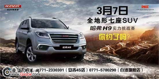 好消息!3月7日(周六)廣西長(zhǎng)道聯(lián)合中國(guó)人壽保險(xiǎn)強(qiáng)強(qiáng)舉辦哈弗H9實(shí)力挑戰(zhàn)賽, 將在廣西長(zhǎng)道安吉4S店野外試駕場(chǎng)隆重開(kāi)戰(zhàn)。哈弗H9實(shí)力挑戰(zhàn)試乘試駕體驗(yàn)會(huì)現(xiàn)已開(kāi)啟全城盛大招募模式!.......誠(chéng)邀各位愛(ài)車人士到店品鑒、賞車,不一樣的熱情服務(wù),不一樣的銷售大使,給你帶來(lái)不一樣的駕乘體驗(yàn)。超多試駕禮品,等您來(lái)拿!活動(dòng)當(dāng)天,成功訂購(gòu)愛(ài)車更有意想不到的超值驚喜。還等什么趕快出手吧!