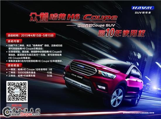 4月15日,主題為“眾籌哈弗H6 Coupe,贏十年使用權(quán)”的活動在”哈弗商城”官微正式啟動,網(wǎng)友只需在“微信朋友圈”中分享哈弗H6 Coupe眾籌信息,邀請親朋好友為自己支付一元錢,即可獲得哈弗H6 Coupe眾籌基金。活動結(jié)束后籌集資金*高的前三名網(wǎng)友,可贏得哈弗H6 Coupe十年使用權(quán)。