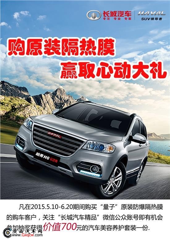 今天關(guān)于如何選擇汽車防爆隔熱膜的小貼士,就分享到這了,廣西長道哈弗哈弗“購原裝隔熱膜 贏取心動大禮”活動即將上線,活動禮包有限,心動的小伙伴們趕快行動吧!