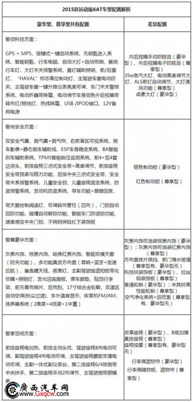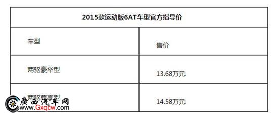 2015款哈弗H6運(yùn)動(dòng)版6AT車型上市兩款配置--豪華型和尊享型,售價(jià)分別為13.68萬元、14.58萬元。