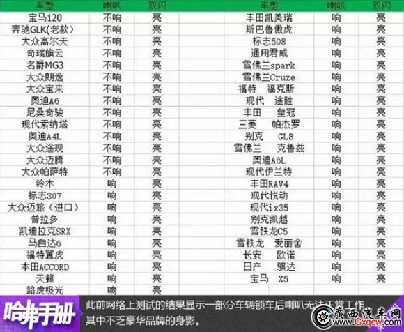 這是此前網(wǎng)絡(luò)上做過(guò)的測(cè)試,表格中的樣本車(chē)輛在鎖車(chē)后雙閃都能夠正常點(diǎn)亮,但一部分車(chē)輛的喇叭啊卻不能在鎖車(chē)后按響。這其中不乏一些合資甚至豪華品牌的身影。我們知道雙閃在夜晚很明顯,但在白天是不容易被人察覺(jué)的。所以喇叭能否正常工作就成了車(chē)內(nèi)向車(chē)外呼救的關(guān)鍵方法。
