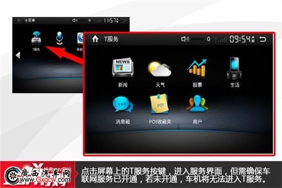在T服務(wù)界面下,用戶可以車主在車載終端點(diǎn)擊“股票、新聞、天氣”按鍵可查詢?nèi)魏喂善毙畔、想要看的新聞、天氣情況,為保證安全,車載終端提供語音播報新聞。
