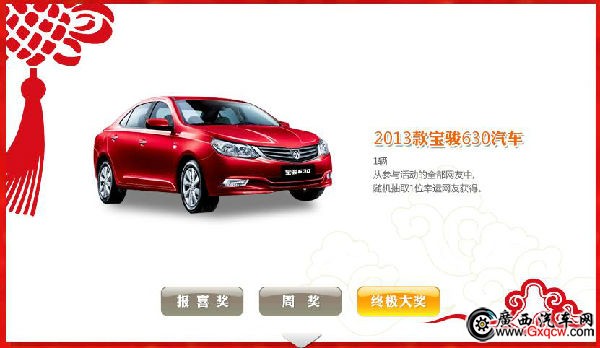 最終大獎(jiǎng)將獲得寶駿630一臺(tái)。所有參與的網(wǎng)友都有機(jī)會(huì)獲得這次抽獎(jiǎng)機(jī)會(huì)。