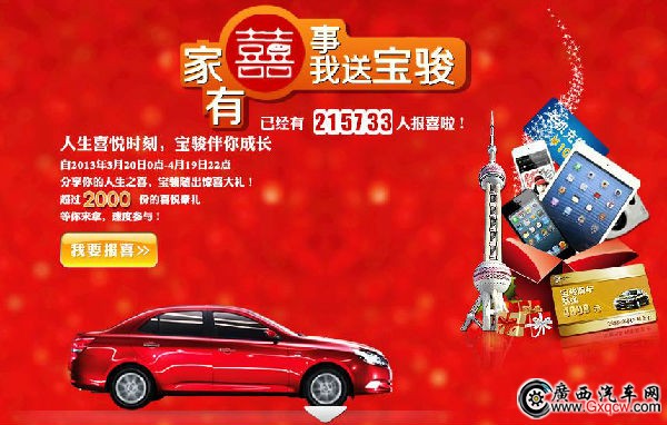 為了感謝廣大寶駿用戶(hù)以及關(guān)注者的厚愛(ài),上汽通用寶駿公司舉辦了“家有喜事,我送寶駿”的活動(dòng)真情回饋廣大網(wǎng)友。獎(jiǎng)品之豐厚,吸引了大量的廣大網(wǎng)友來(lái)參與,截止4月2號(hào),參與人次已經(jīng)突破215733人次。人數(shù)還在不斷的激增中。
