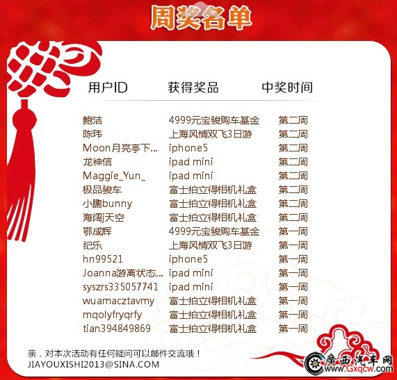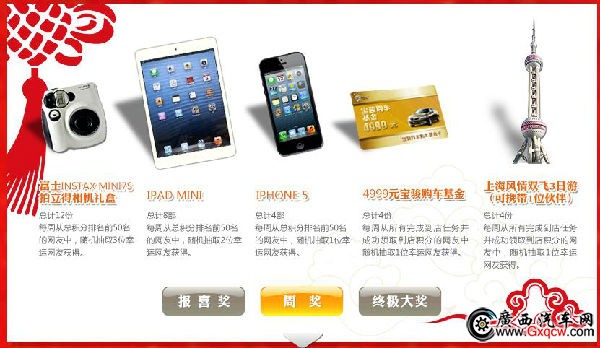 周獎(jiǎng)的禮品更為豐厚,有富士拍立得相機(jī)禮盒、IPAD MINI、IPHONE 5、4999元的寶駿購(gòu)車(chē)基金、上海風(fēng)情雙飛3日游(可攜帶1位伙伴)。