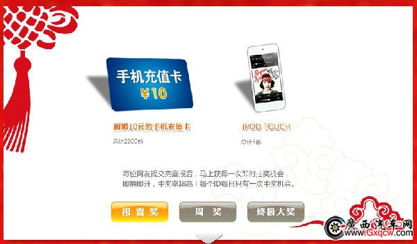 報(bào)喜獎(jiǎng)有:10元面額的手機(jī)充值卡和IPOD TOUCH。