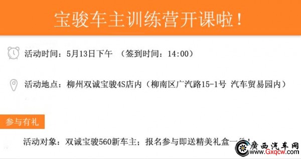 5月15日,汽貿(mào)園柳州雙誠寶駿店,即將舉辦“五菱寶駿車主訓(xùn)練營”活動(dòng),通過大講堂等形式,讓車主更了解愛車養(yǎng)護(hù)知識(shí)、車輛續(xù)保知識(shí),與專業(yè)寶駿管家面對(duì)面互動(dòng)交流,零距離感受至誠服務(wù)。