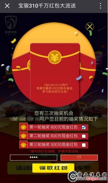▼活動(dòng)介紹:寶駿310千萬(wàn)紅包大派送,紅包瘋狂送不停!即日起至10月31日全天紅包瘋狂送,參與抽獎(jiǎng)即可有機(jī)會(huì)獲得200-4999元不等的現(xiàn)金購(gòu)車(chē)獎(jiǎng),每人有3次抽獎(jiǎng)機(jī)會(huì)!