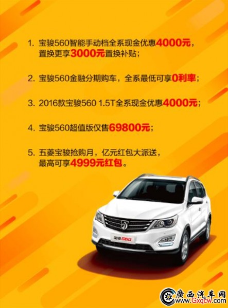 寶駿560智能手動(dòng)檔、1.5T全系現(xiàn)金直降4000元!首付低至1.5萬(wàn)!不限品牌置換再享3000元現(xiàn)金補(bǔ)貼!寶駿SUV,寬大更舒適,實(shí)在更實(shí)惠,安全更安心,您值得擁有!