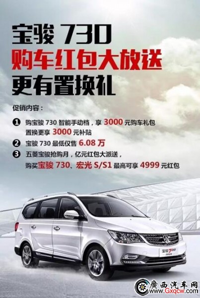 寶駿730特價(jià)直銷,三排七座超大空間,全家出行幸福之選,智能手動(dòng)檔全系送3000元大禮包!不限品牌以舊換新再享3000元現(xiàn)金補(bǔ)貼!