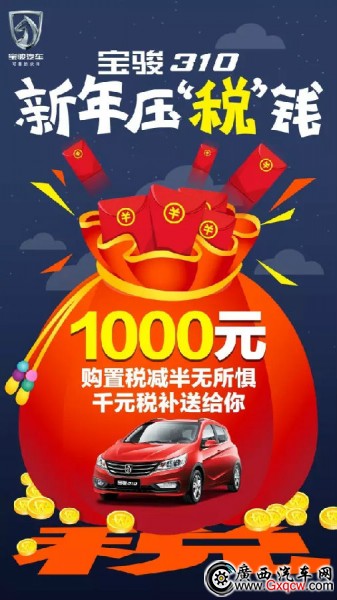 活動期間,到汽貿(mào)園柳州雙誠4S店,下訂購買寶駿310,只要在2017年1月1日-1月27日之間交車,均可享受1000元購置稅補貼!