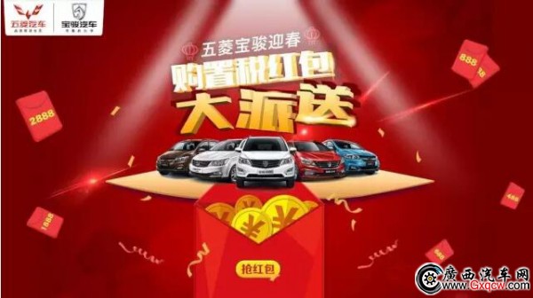 五菱寶駿汽車迎春購(gòu)置稅紅包大派送。388-2888元紅包,訂車客戶即刻抽;100%中獎(jiǎng)。抽到多少即可抵多少車款!機(jī)會(huì)不要錯(cuò)過(guò)!