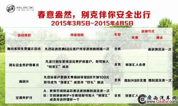 羊年春天的腳步已經(jīng)走近,不少車主朋友又到了駕駛愛車出行踏青的時候。萬物復蘇少不了綿綿春雨的滋潤,冬季后的愛車也需要一次精心的養(yǎng)護。為此玉林弘通別克4S店傾情為廣大車主朋友開展“春意盎然,別克伴你安全出行”的主題活動,為廣大車主春季踏青出行及雨天行車提供安心的養(yǎng)護。詳情請洽玉林弘通別克4S店售后服務(wù)部0775-2293663