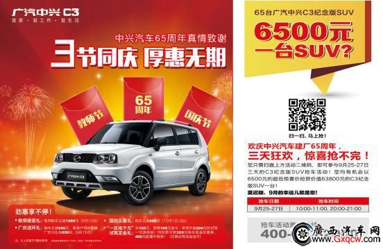 中興汽車始于1949年,到2014年已有65年歷史。值此普天同慶的大喜日子,宜昌廠家推出65臺廣汽中興C3廠慶版,只要6500元就有機(jī)會獲得63800元的紀(jì)念版廣汽中興C3。