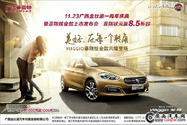 金壯源一周歲生日party ,菲翔土豪金上市會(huì),浪漫意大利風(fēng)情之夜,盡在11月23日晚20:00廣汽菲亞特南寧金壯源4S店廣場(壯錦大道與國凱大道交匯處機(jī)場那洪收費(fèi)站旁)歡歌盛舞,美食紅酒,香車美女,與您共度良宵,敬請(qǐng)期待。