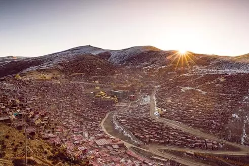 匆匆吃過早餐后,我們循著陽光,橫跨600多公里,一路向西北,直到色達。終于,功夫不負有心人,一片“紅色盛宴”被我們盡收眼底。