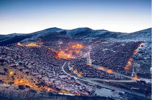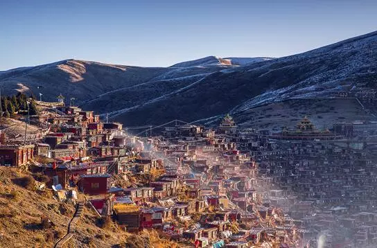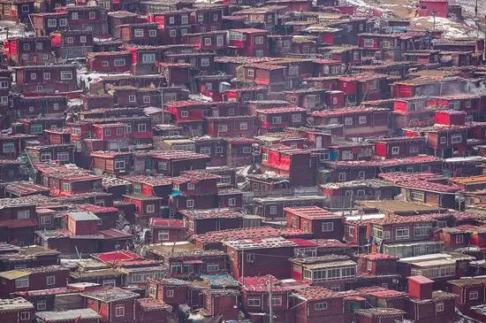 今天**個目標地,就是色達佛學(xué)院。二次登臨佛學(xué)院,終于揭開了它神秘的面紗:在重重的群山環(huán)繞之中,溝里的僧舍,以佛學(xué)院的大經(jīng)堂為中心,密密麻麻搭滿了四面的山坡,不計其數(shù)的絳紅色小木屋,延綿無數(shù),一眼望不到頭。這些紅色小木屋,是一萬多名僧侶的住所。佛學(xué)院男女涇渭分明,住處有所區(qū)隔。