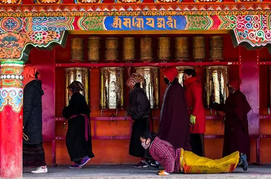 谷底和山梁上分布著幾座寺廟和佛堂,建筑規(guī)模雖都不很大,但裝飾考究而輝煌;身披槳紅色僧袍的喇嘛和尼姑來來往往,空氣中充滿平靜祥和的氣氛。