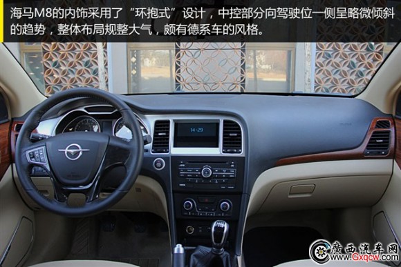 內(nèi)飾方面,海馬M8采用了中控臺(tái)“環(huán)抱式”設(shè)計(jì),整體布局中規(guī)中矩,給人很規(guī)整的感覺,這點(diǎn)頗有德系車的風(fēng)格。顏色采用上深下淺的搭配方式,中間加入了仿木紋圖案的裝飾條用來提升檔次。