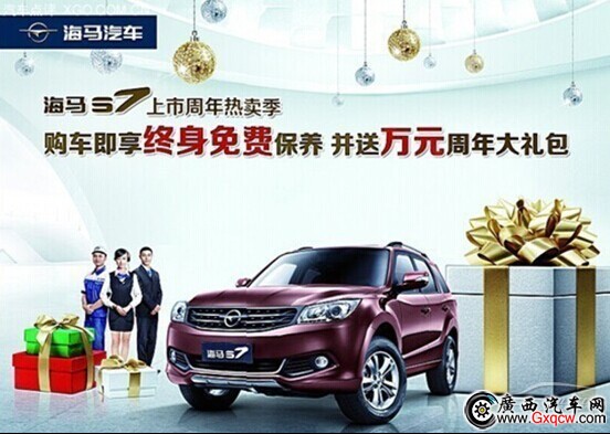 輕輕的我走了正如我輕輕的來(lái)··海馬S7自2013年6月5日“出生”之后,今年迎來(lái)自己的**生日,他得到了越來(lái)越多消費(fèi)者的好感和青睞,成為自主SUV領(lǐng)域又一明星車(chē)型。為回饋廣大消費(fèi)者對(duì)海馬S7的關(guān)注與厚愛(ài),即日起,只要到柳州華明海馬汽車(chē)購(gòu)買(mǎi)S7的車(chē)主朋友們,即可享受免費(fèi)終身保養(yǎng)!“小7”我將以身相許,到時(shí)侯,我“娘親”(柳州華明海馬汽車(chē)4S店)還會(huì)有諸多“嫁妝”,諸多驚喜好禮相送,試駕好禮、購(gòu)車(chē)鉅惠期待你的參與!  海馬S7上市一周年感恩鉅惠,到店即有禮!參與有好禮!購(gòu)車(chē)優(yōu)惠與信貸支持兩不耽誤,讓你輕輕松松實(shí)現(xiàn)擁有SUV的夢(mèng)想。這個(gè)夏天,讓我們對(duì)海馬S7“全城熱戀”吧!詳情請(qǐng)咨詢(xún)柳州華明銷(xiāo)售服務(wù)店貴賓熱線0772-8803088