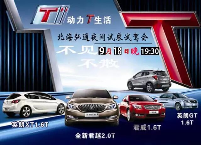 9月18日晚19:30,北海弘通別克開展“T”速夜行夜間試乘試駕會(huì),君越、君威、昂科拉(“Turbo”車型)活動(dòng),將帶你深度體驗(yàn)通用首創(chuàng),別克Turbo的動(dòng)力優(yōu)勢(shì),挑戰(zhàn)你的腎上腺素!