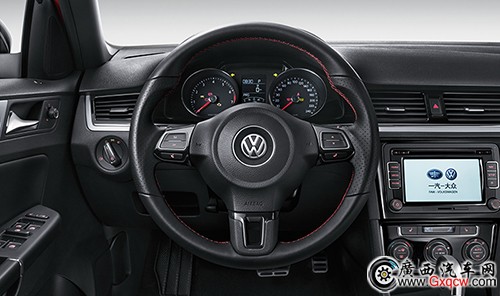 寶來Sportline三幅式多功能方向盤在三點(diǎn)和九點(diǎn)位置采用打孔真皮包裹,配合紅色縫線,在視覺效果上與高爾夫GTI所配備的運(yùn)動(dòng)方向盤較為接近。
