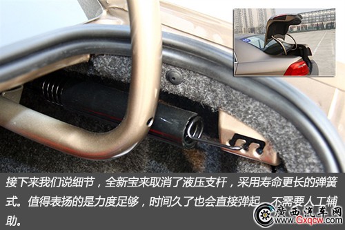 接下來我們說細(xì)節(jié),全新寶來取消了液壓支桿,采用壽命更長的彈簧式。值得表揚的是力度足夠,時間久了也會直接彈起,不需要人工輔助。