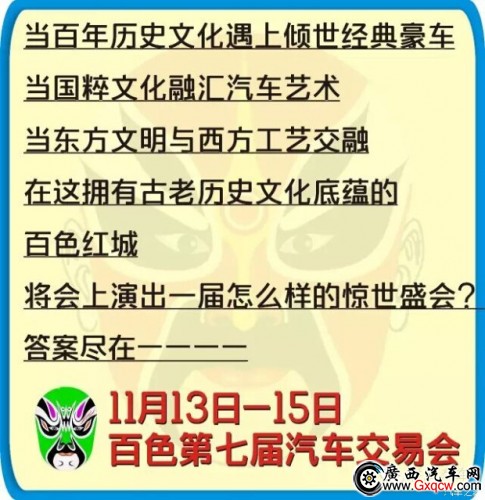 “轉(zhuǎn)角遇到愛”中西經(jīng)典巡游,由多輛裝飾著國粹臉譜新車組成的護送車隊將陪同老爺車一起走上百色街頭,他們或許在不經(jīng)意間就出現(xiàn)在你的面前,一起期待吧!