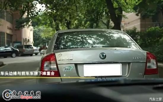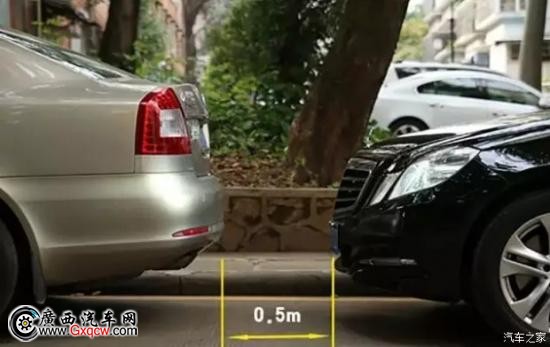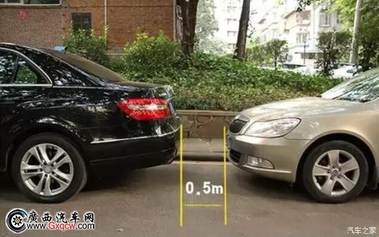 如果在后視鏡中剛好能看見后車擋風(fēng)玻璃,此時與后車的距離大概還剩0.5m,即可完成停車。