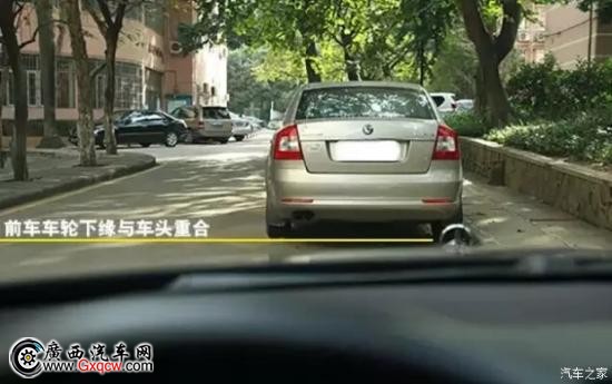 當(dāng)轎車車頭邊緣與前車車牌下緣重合,此時與前車的距離大概是0.5米。這時候就兩車的距離就是比較合適,可以拉起手剎停車了。