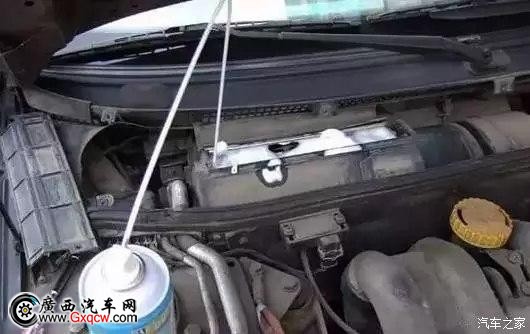 ② 找到發(fā)動(dòng)機(jī)艙里的進(jìn)氣口,朝里面噴清洗劑,然后啟動(dòng)車子讓空調(diào)運(yùn)轉(zhuǎn),*后在車內(nèi)接臟水。