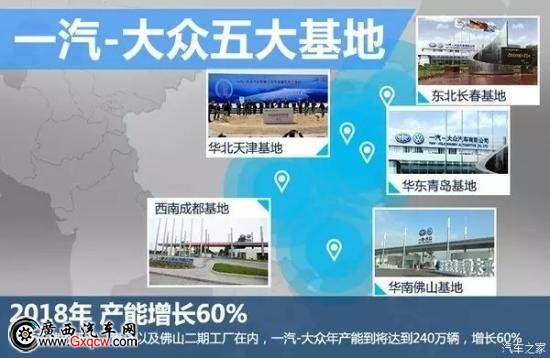 預計到2018年,一汽-大眾將擁有五大產業(yè)基地,實現(xiàn)年產量增長60%的戰(zhàn)略目標。其中東北長春基地貢獻66萬輛,西南成都基地貢獻54萬輛,華南佛山基地貢獻30萬輛,2017年建成的佛山二期項目將再貢獻30萬輛,同樣計劃2017年完工的華東青島基地和計劃2018年完工的華北天津基地也將各自貢獻30萬輛。截止至2018年一汽-大眾五大基地將全部建成并投產,屆時年產能將達到240萬輛,較目前水平增長60%。