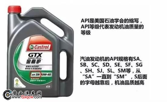 汽油發(fā)動(dòng)機(jī)的API規(guī)格有SA、SB、SC、SD、SE、SF、SG、SH、SJ、SL、SM等,從“SA”一直到“SM”,每遞增一個(gè)字母,機(jī)油的性能都會(huì)優(yōu)于前一種,機(jī)油中會(huì)有更多用來保護(hù)發(fā)動(dòng)機(jī)的添加劑。字母越靠后,品質(zhì)越高。