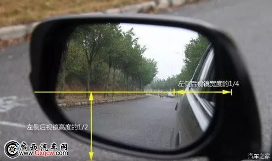 同樣要保證坐姿正確,然后調(diào)整左后視鏡。使你的左側(cè)車身映像占據(jù)鏡子右側(cè)的四分之一區(qū)域,遠處的地平線位于鏡子的中央。