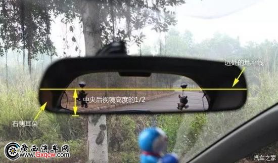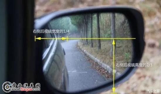 使右側(cè)車身映像占據(jù)鏡子左側(cè)的四分之一區(qū)域。遠處的地平線位于鏡子的中央。