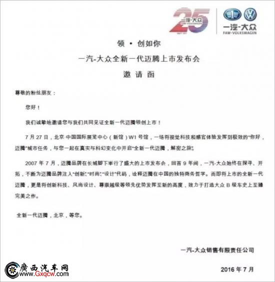 一汽-大眾邁騰上市首次給粉絲發(fā)邀請(qǐng)函